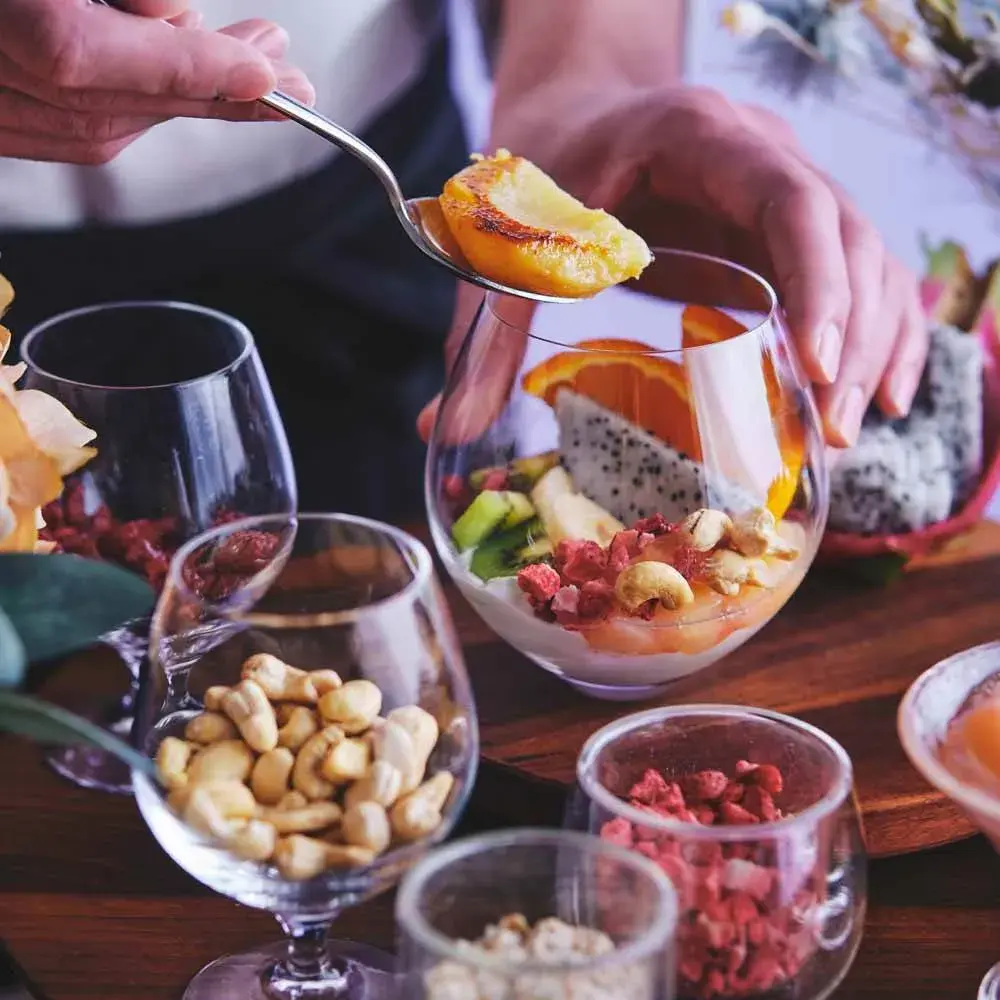地上200メートルの絶景とともに、夏限定の贅沢なスイーツタイムを堪能できるのが、コンラッド大阪40階「アトモス・ダイニング」で開催中の「Craft Your Parfait」ピーチ&ヨーグルトスイーツビュッフェ。みずみずしい桃を主役に、ヨーグルトと多彩なトッピングを自由にカスタマイズできるDIYカウンターが登場。まるで自分だけのパフェを作るようなワクワク感が楽しめます。