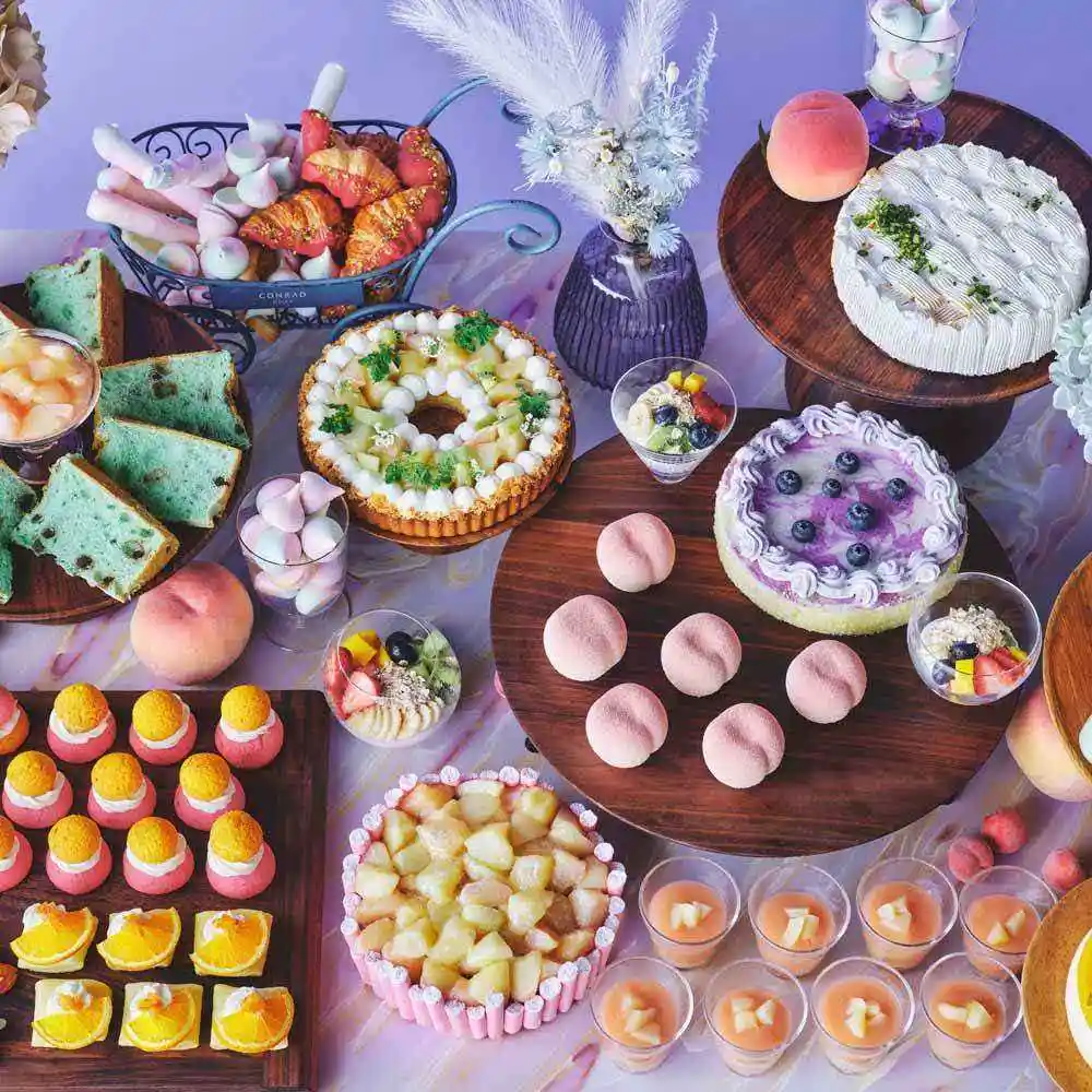 そのほか、ピーチとチョコミントのシフォンケーキやピーチ大福など、季節感たっぷりのメニューが勢ぞろい。セイボリーもピーチを活かした前菜やパニーニが充実し、夏の昼下がりを彩ります。パノラマビューとともに、心まで満たされるサマービュッフェ体験をどうぞ。