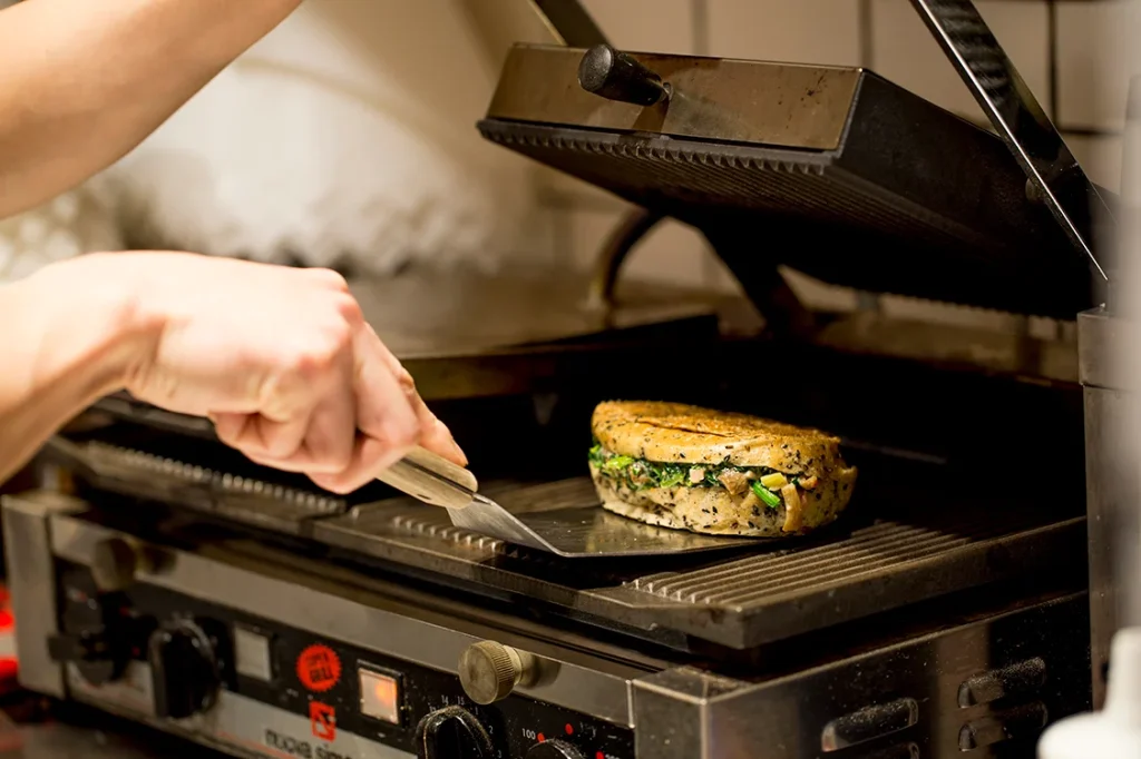アンティコカフェ アルアビス ハービスプラザエント店の看板メニューは、自家製のパニーニ。フィリングに合わせて焼き上げた香ばしいバンズに、作りたてのデリカやハムをたっぷりサンド。注文ごとにグリラーで仕上げるスタイルで、外はカリッと、中はふんわり。片手で食べられる手軽さもあり、ランチや軽食にぴったりです。