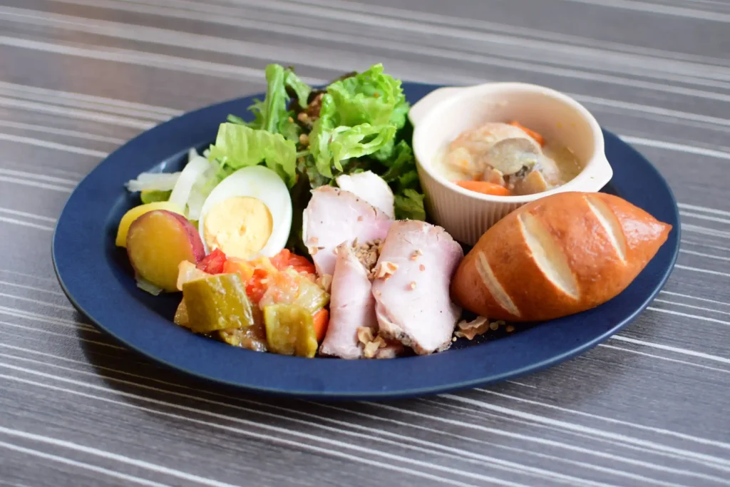 看板メニューは、選べるメインにサラダ、自家製デリ4品、有機米粉のプレッツェルがついた「booのデリサラダセット」(1,290円~)。メインのひとつは、脂身まで甘みを感じる熊本産の「火の本豚」に、特製オニオンソースで深みを添えた「火の本豚ローストポーク」。