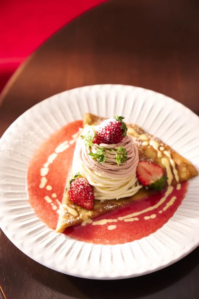 甘党派には、苺のスープでいただく華やかな「苺とホワイトチョコのモンブランクレープ~苺のスープ仕立て~」もおすすめ。毎年大人気の季節限定の味わいを楽しんで。