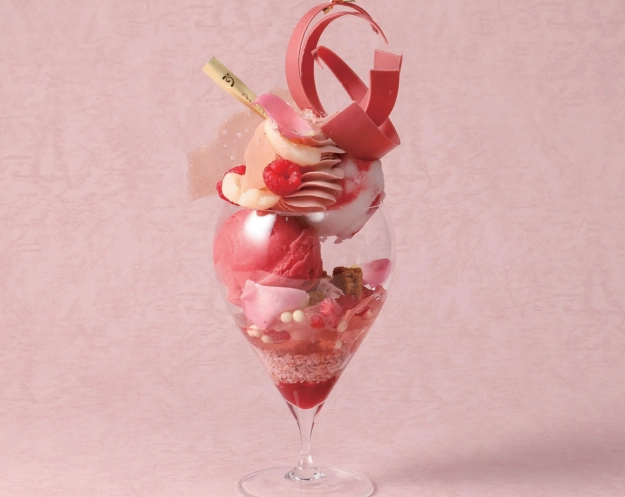 人気メニューのパフェ「Ariana(アリアナ)」(期間限定)は、ラズベリーやライチの甘酸っぱさと、ピンクローズジュレの華やかさが特徴の、まるで物語の主人公になったような一品。ラズベリーショコラクリームのやさしい酸味と、サクサクとしたクランチの食感が重なり合い、食べ進めるごとに異なる表情を見せてくれます。