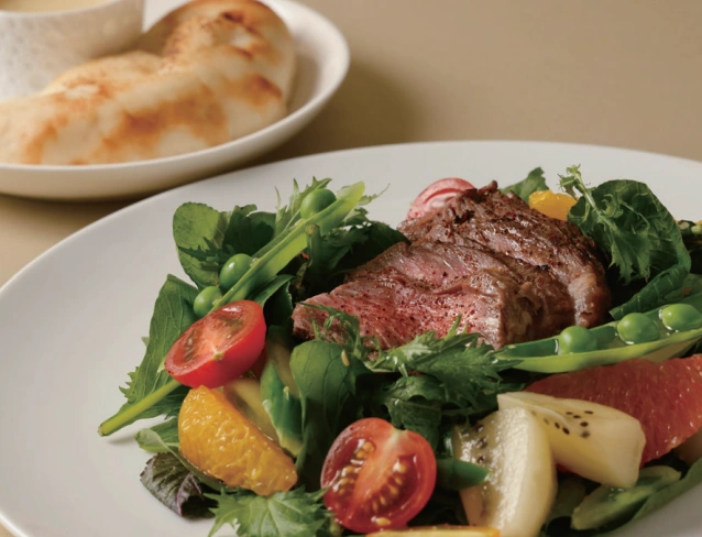 「熟成牛ハラミとフムスの彩りリースサラダ」は、ジューシーな牛ハラミとフムス、色とりどりの野菜やフルーツをリース状に盛り付けた一皿で、見た目にも鮮やか。フォカッチャ付きで満足感も◎
