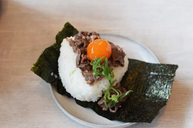人気メニューの「贅沢おにぎり」シリーズは、見た目も華やかで食べ応えあり!例えば、「黒毛和牛と卵黄のすき焼風」は、甘辛く煮込んだ和牛ととろりとした卵黄が絶妙にマッチ。「大葉明太エビマヨ」は、ピリ辛の明太子とプリプリのエビが大葉の香りとともに楽しめます。