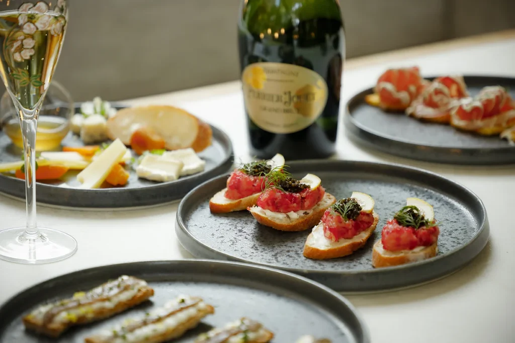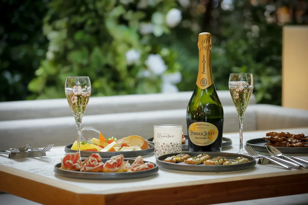 「ペリエ ジュエ グラン ブリュット」を含む90分のフリーフロープランに、シェフが手がけるカナッペ3種を添えて提供。みずみずしい季節の恵みを感じさせる味わいと、エレガントな泡とのマリアージュが、午後のひとときを洗練されたひと幕へと導きます。