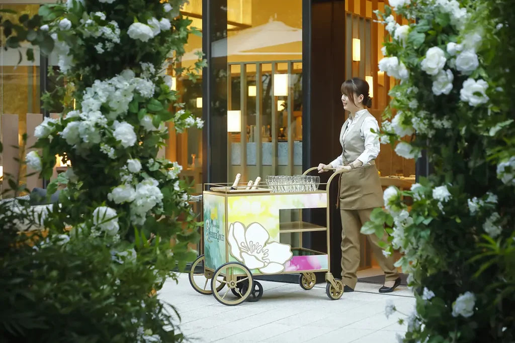 テラスには、ブランドの象徴である白いジャパニーズ・アネモネ(秋明菊)をモチーフにしたアーチがしつらえられ、優美な世界へと誘います。また、専用シャンパーニュワゴンがテーブルを巡り、グラスを満たしながら、その場で一杯をお届けする演出も。