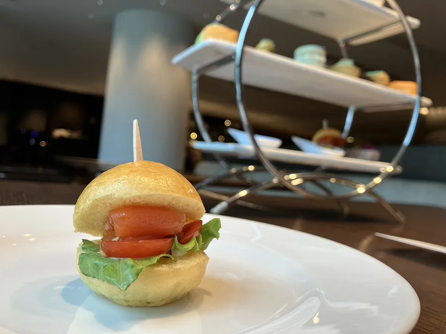 ハンバーガーも一口サイズながらスモークサーモンと野菜の味がしっかりと感じられて満足の一品。
