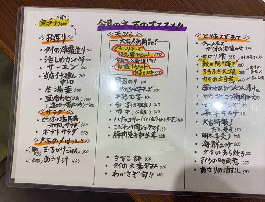 メニュー(内容は取材時のもの。季節によって変わります)を見てみると、一番目に書かれているのはお刺身のメニュー。