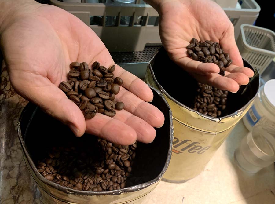 「詳しい方でないと少し分かりにくいのですが…」と、焙煎した豆を見せていただきました。ほぼ同じように見える2つの豆ですが、中央に入った切れ目や、色味、豆自体の大きさなどが少しずつ違っています。