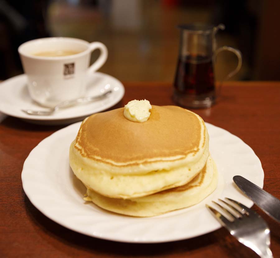 粉から丁寧に作り、一枚、一枚、専用のフライパンで手焼きするホットケーキはあつあつ、ふわふわ。メープルシロップをトロッと回しかけて、バターと一緒にいただきます。きれいな焼き色の表面に思わずウットリしてしまいますね。