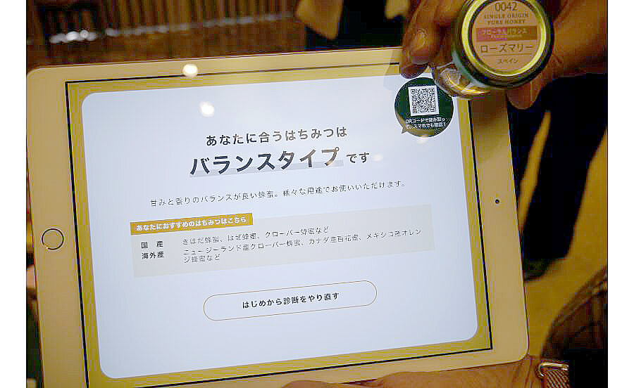 また「ミールミィ」の注目は、タブレットで簡単な質問に答えると自分の好みのハチミツのジャンルが分かるという取り組みも。シンプル、リッチ、フローラル、フルーティ、バランスという5つのハチミツのジャンルがあり、ちなみに私は珍しい「バランス」なんだとか。こういうのも面白いですね。