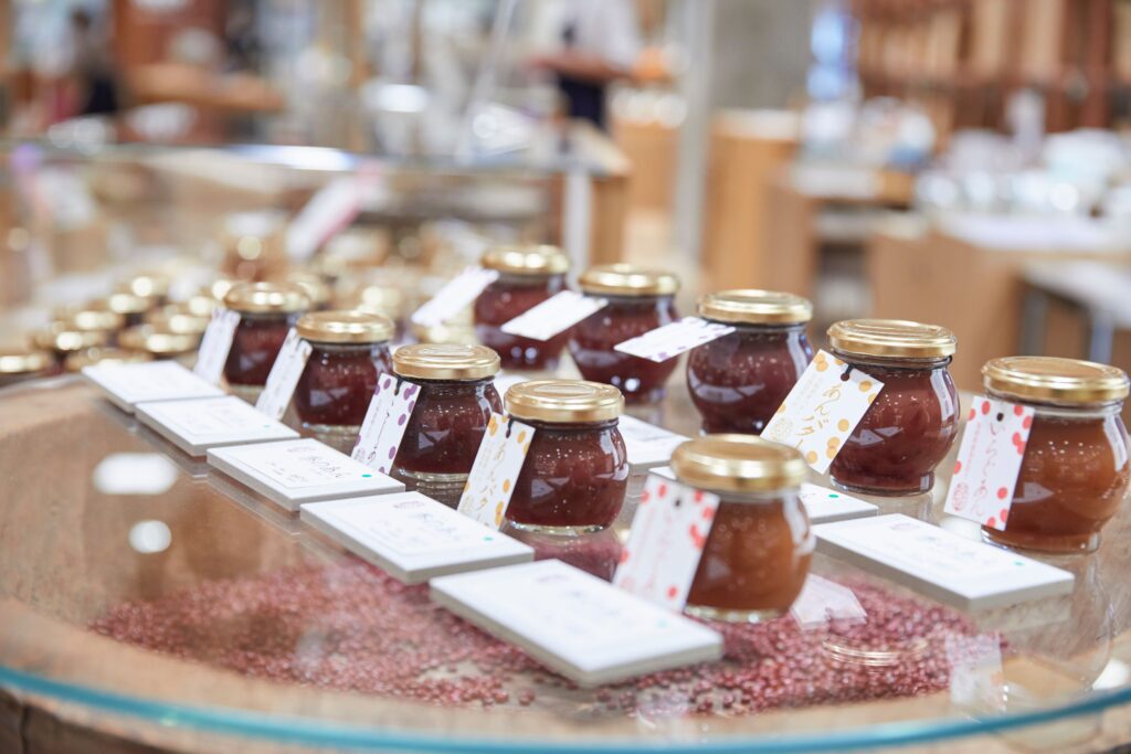 ここで気になるのは、瓶詰めされた5種類の餡「季(とき)のあん」。定番の「つぶあん」、「こしあん」に季節ごとの「いちごあん」に、「ももあん」。それに、つぶあんに国産の有塩バター、ハチミツをあわせて丁寧に炊いた「あんバター」です。