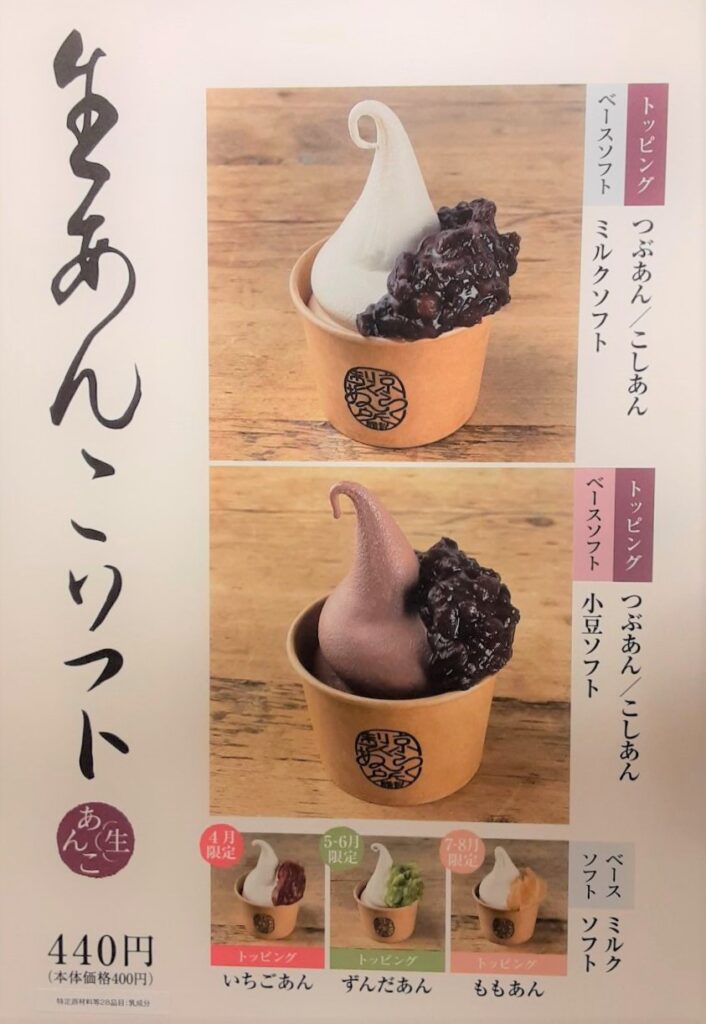 ほかにミルクか小豆のソフトにつぶあんかこしあんをトッピングできる「生あんこソフト」440円も登場。こちら季節によって上のトッピングのあんが、いちごやずんだ、ももなどになるんだとか…。楽しみ。