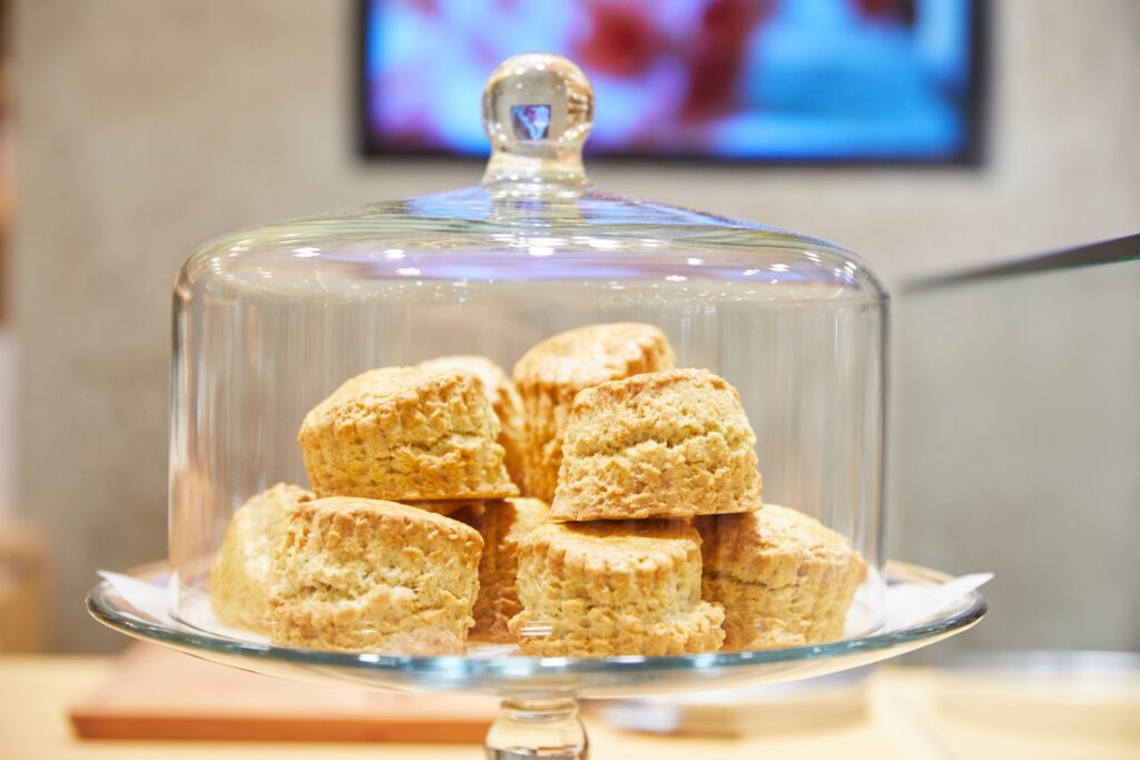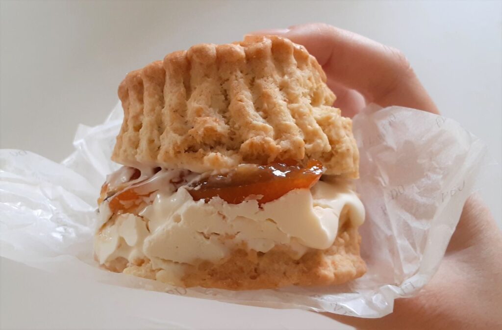 気になっていたのが「スコーンサンド」です。これは店内の厨房で焼いたスコーンに注文が入ってから、ダブルクリームとコンフィチュールをサンドしてくれるもの。