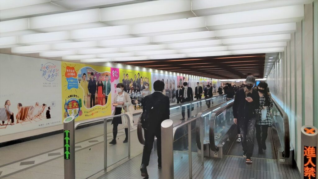 ここは、阪急電車からもすぐですが大阪メトロもこのすぐ下に駅があり、右へ行けばJR大阪駅、左の通路(うめだ阪急のシースルーウインドーはこの右側にあります)を進んで地下へ行けば阪神電車と抜群の立地の良さです。
