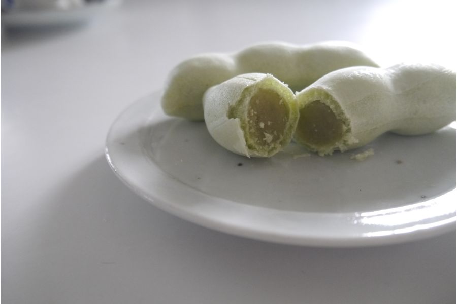 まずこの見た目のキュートなこと!そして、封を開けた途端周囲に漂う豆のいい香り!実は、大館市は昼夜の寒暖差が激しく、甘く味の良いえだまめを作ることができるんです。そんな地元の枝豆をふんだんに使用した枝豆餡が、このキュートなモナカにぎっちり入っています。