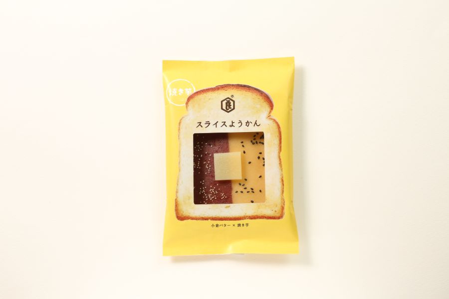 定番の「スライスようかん(小倉バター)2枚入り」540円は、丹波大納言小豆の粒あん羊羹を薄くスライスし、沖縄の塩を利かせたバター羊羹とケシの実をトッピング。食パンに乗せて焼けば、簡単に小倉バタートーストになるという画期的な商品です。その季節限定版として今秋登場したのが「スライスようかん(焼き芋)」なんです。