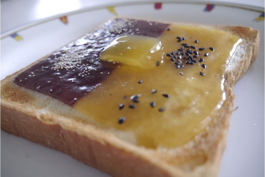 ケシの実がアクセントの定番「スライスようかん(小倉バター)」と、シナモンが香る「スライスようかん(焼き芋)」がハーフに。「スライスようかん(焼き芋)」は、焼き芋羊羹に自家製キャラメルと生クリームを合わせ、ほんのりシナモンを利かせた和洋折衷感。焼いている時からシナモンが香って、食欲をそそり期待は最高潮に。口にすると濃厚でクリーミーな味わいは、芋好き必食の一品です。ハーフにしてあることで芋と小豆という甘みの種類が変わり、そこに焦がしバター羊羹の甘じょっぱい感じも食べていて楽しい!