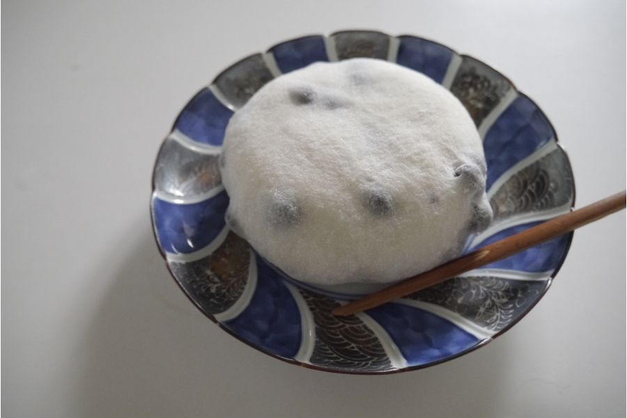 「美好屋」では、手作業で大福を包んでいるのですが、手のひらサイズの大福ならともかく、こんなに大きな大福を均等に包むのは至難の業。熟練の職人だからこそできた商品なんだそうです。「MEGA大福」切ってみるとわかるように餅が厚め。そして”餅屋”さんだけあって、お餅が本当においしいんです!餅生地には、ふっくら大粒の北海道産黒豆が入っていて、これがまた美味。