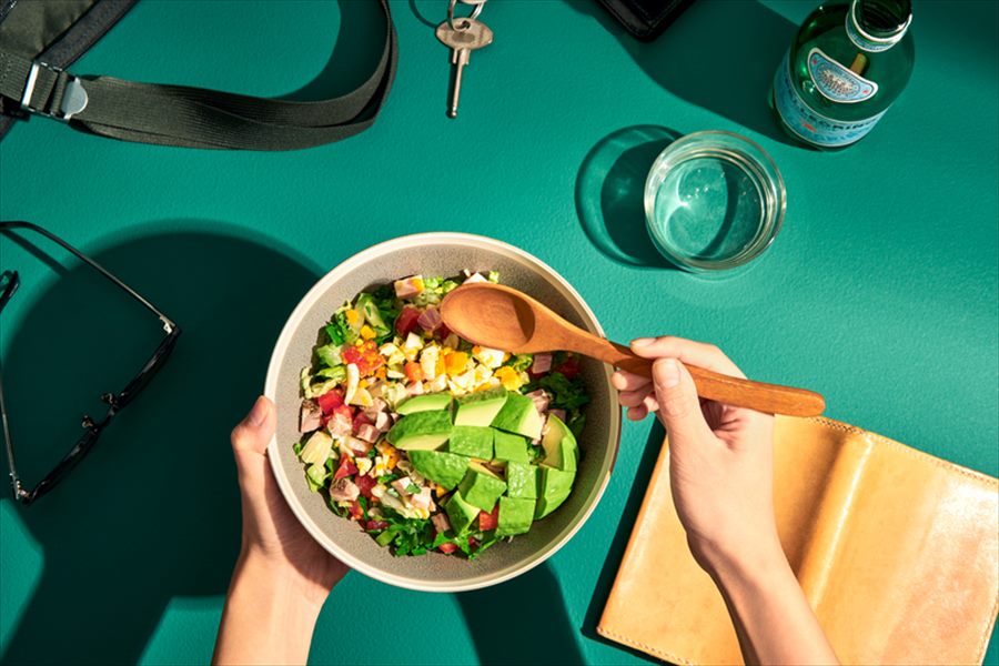 「CRISP SALAD WORKS」 の特徴は、ダイエットのためやサイドメニューではなく、メインディッシュとして食べるサラダであること。特に、バランスよく組み合わされ細かく刻んだ食材を「スプーンで食べられるカスタムサラダ」というスタイルにすることで、おいしく食べられるだけでなく、1食で1日に必要な野菜350gを摂取することができるのもうれしいポイント。もちろん自分で好きな食材を組み合わせたサラダにすることもできる。