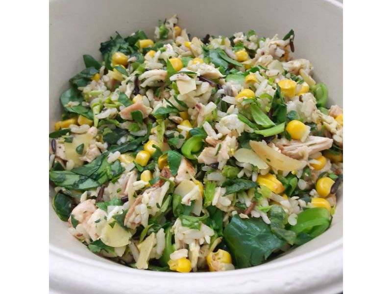 スナップエンドウとアーモンド、雑穀米の様々な食感がとにかく楽しく、かなりのボリュームですが本当にお腹いっぱいになります。
