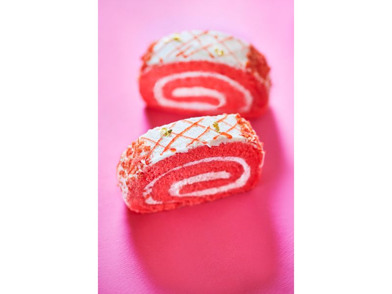 また、こちらも鮮烈なピンクが目を引く「ルビーロールケーキ」(1カット)703円、(1本)2,701円。
