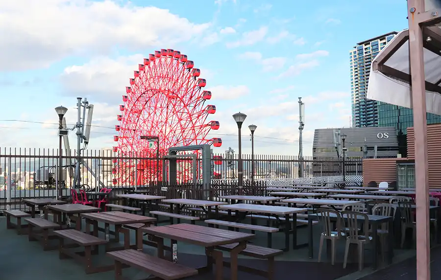 「阪急トップビアガーデン」は先ほどのアクセスの通り、阪急大阪梅田駅直結…というか駅の屋上! ですので「阪急トップビアガーデン」は、梅田のランドマークでもあるHEPの赤い観覧車、キラキラしたビルなどに囲まれた都会の真ん中のビアガーデンです。駅チカなのでいろんな人が訪れやすいのもうれしいですね。