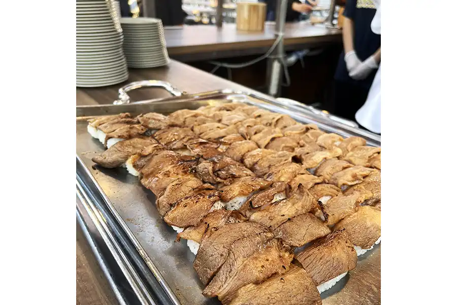 そして注目はなんといっても牛肉のお寿司を大きなバーナーで炙って仕上げる炙り肉寿司も。お肉好きはぜひたっぷり堪能して!