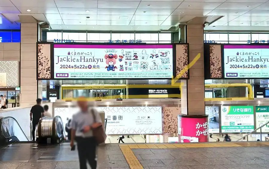 ツインビジョンの下、黄色で囲んだ部分が梅田ターミナルビルの入り口です。