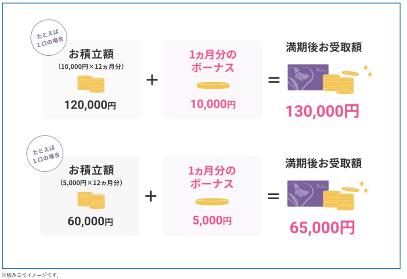 毎月1万円、5千円と積み立てて、その1カ月分が追加でボーナスとして12カ月後にチャージされています。積立ててお得、1年後に何を買おうかと思い描く楽しみ、金利を考えたときの利率の高さなど、お得がいっぱいです。