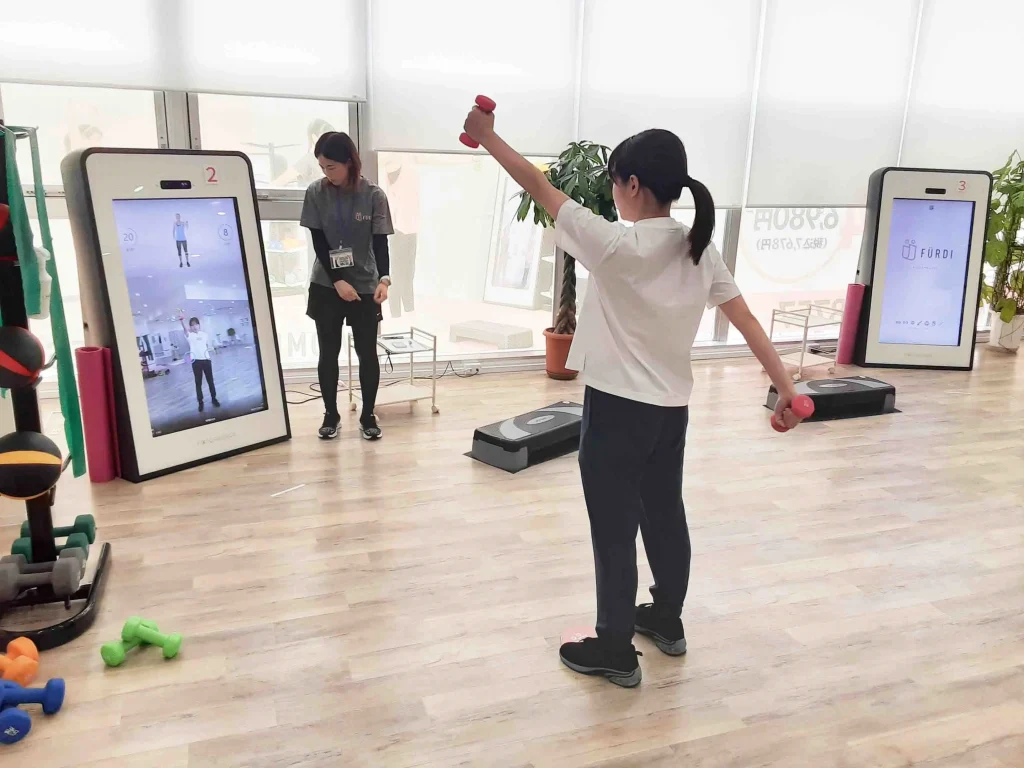 無料体験では、約10分の無料体験用のトレーニングメニューにチャレンジします。 ファディーの特長の一つは、マシンの巨大モニターに、お手本となるAIトレーナーと自分の姿が並んで表示され、正しい動きを確認しながらエクササイズできること。