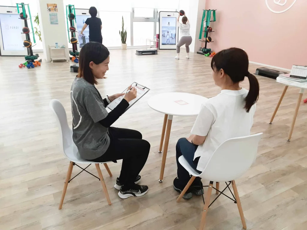 測定後、現在の身体の状況や運動歴、悩み、目標などをトレーナーさんとお話しします。 ファディーは女性専用ジムなので、トレーナー、会員ともに全員女性。女性同士なので気軽に相談しやすい雰囲気です。