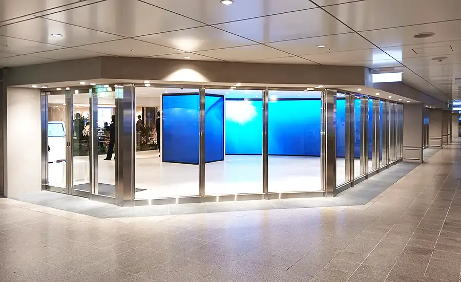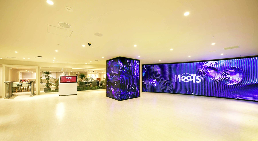 それでは「阪急阪神MEETS」の顔でもある「MEETS Square」からご紹介します。眩しいほどに明るい大型LEDビジョンが目印の「MEETS Square」は情報を得られるエントランス。壁と柱で連動したLEDビジョンでは、「100年まちを創ってきた これからの100年も創る」というキーワードをイメージしたエンターテインメント映像など、様々な最新情報を発信。また、「阪急阪神MEETS」の施設や街、すまいに関する情報を得ることができるタッチパネルも備えています。