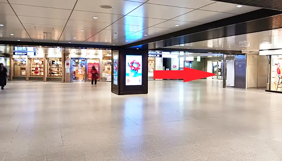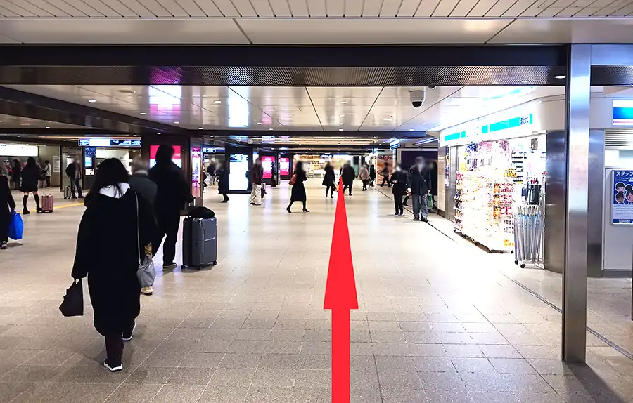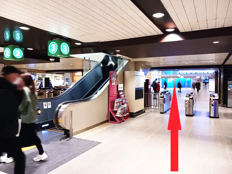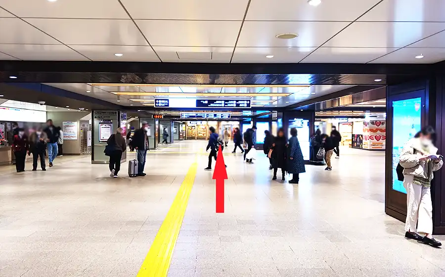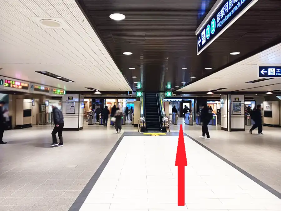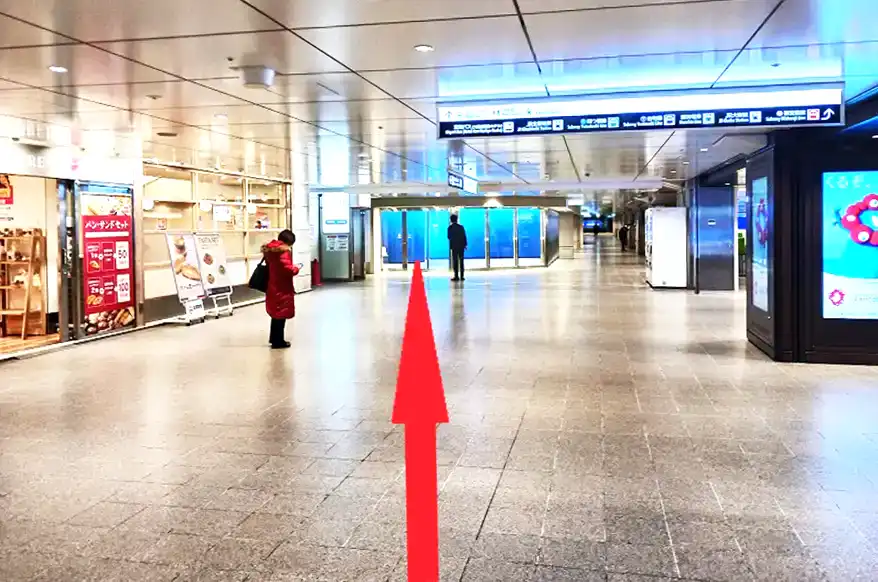 1 JR大阪駅との連絡橋を渡り、阪急大阪梅田駅2階中央改札を目指します。阪急大阪梅田駅2階中央改札が見えればその手前を右折します。