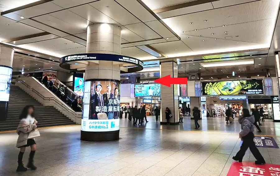 1 阪急大阪梅田駅1階コンコースを目指します(ビッグマンがある場所です)。赤い矢印の阪急大阪梅田駅2階に「阪急阪神MEETS」があります。エスカレーターや階段をあがって右折すれば「阪急阪神MEETS」です。