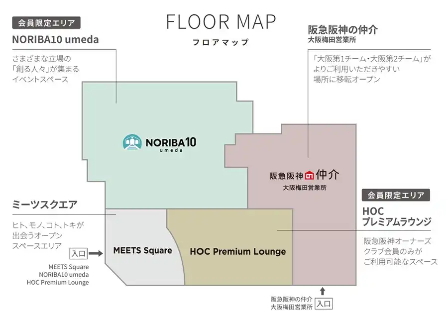 そんな「阪急阪神MEETS」には、「MEETS Square」、「HOC Premium Lounge」、「阪急阪神の仲介 大阪梅田営業所」、「NORIBA10 umeda(ノリバテン ウメダ)」の4つのゾーンで構成されています。