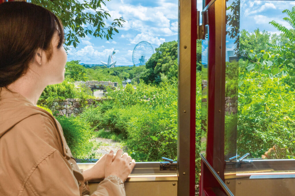 車窓から木々の向こうに太陽の塔が見えたり、モミジのトンネルをくぐり抜けたりと眺望ポイントが多数ある。車掌さんによる詳しいガイド付きで、一周約30分の道のりもあっという間。