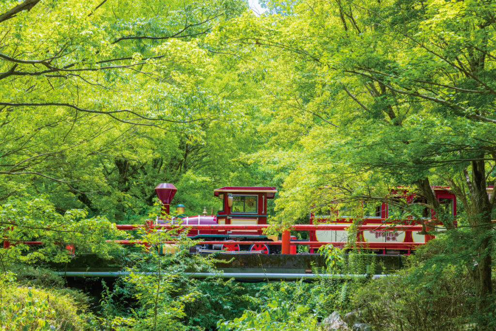 万博記念公園の自然文化園エリアを走る「森のトレイン」。洋風でレトロな車両デザインは、1880年にアメリカから日本に輸入された蒸気機関車「弁慶号」がモチーフ。園内の移動手段として利用されているほか、徒歩で巡るよりも広いエリアを短時間で周遊できると人気。
