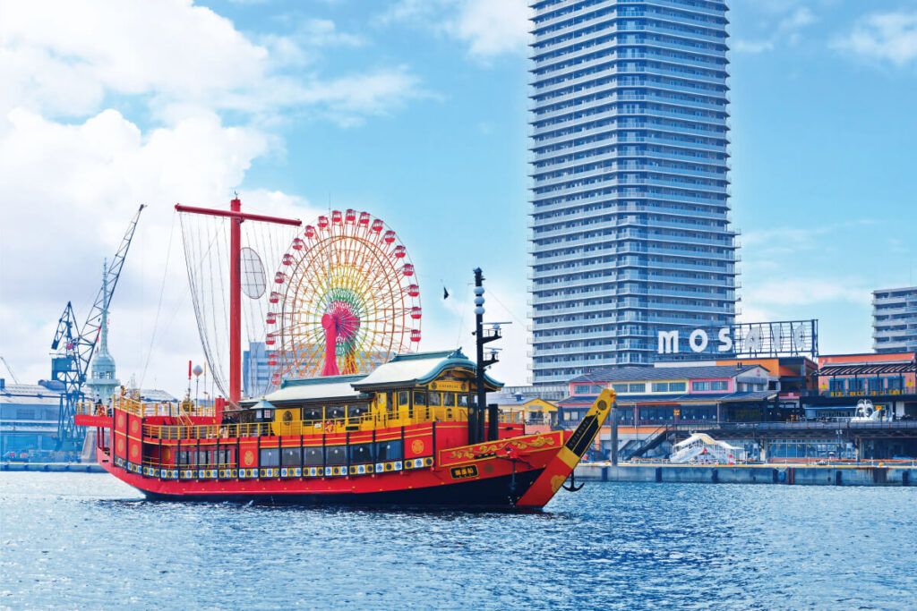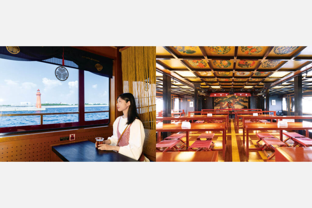 神戸港でひときわ目を引くのが「御座船安宅丸」。定員500名の大型遊覧船で、江戸幕府3代将軍・徳川家光の命により造船されたと伝わる、かつて実在した巨船「安宅丸」をモチーフにつくられた。2017年には、著名なデザイナー・水戸岡鋭治がデザインのリニューアルを手がけたことでも話題に。船内には温かみのある木がふんだんに使用され、古今東西の様式を組み合わせた華やかで品格のあるデザインが印象的だ。