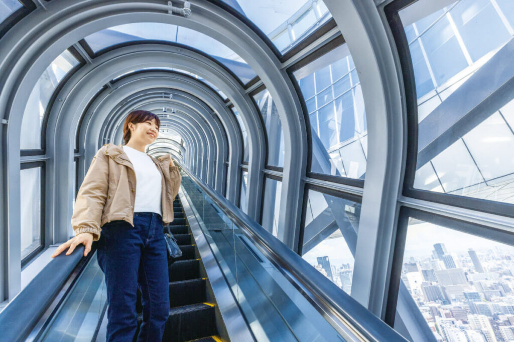 中央の大きな孔(あな)は”宇宙船が飛び立っていった痕跡“をイメージしてデザインされたという興味深い話もある。壁面がシースルーになっている不思議な「空中エスカレーター」で向かった先にあるのは、360度を見渡せる「空中庭園展望台」。大阪港に日が沈む夕景や煌(きら)めく夜景など、刻々と変化する景色はどの時間帯も格別。時間を変えて再訪するのもおすすめだ。