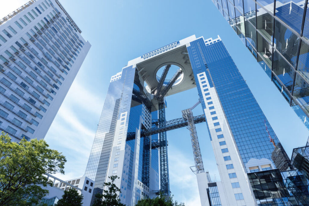 1993年に誕生した「梅田スカイビル」。建物外壁のハーフミラーガラスには時折空や雲が映り込み、地上173mの「空中庭園」(二棟の建物をつなぐ上空の連結部分)はまるで空に浮かんでいるかのよう。その建築美もさることながら、「空中庭園」の部分は地上で組み立て、ワイヤーで毎分35cmずつ吊り上げるリフトアップ工法が採用され、当時世界初の試みとして話題を呼んだ。