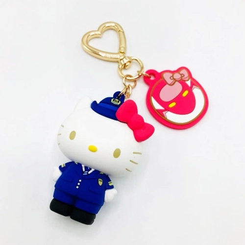 制服を着たハローキティの立体キーホルダーです。カラビナ部分はハートの形。